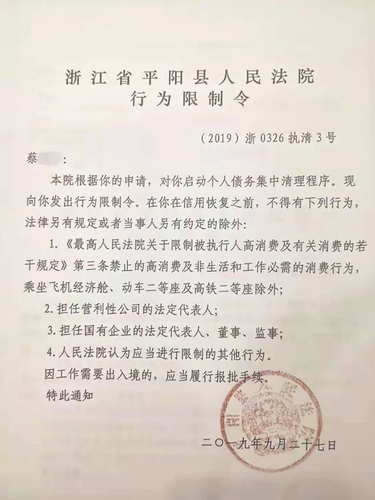9月27日,平阳法院签发了对蔡某的行为限制令,并终结对蔡某在本次清理所涉案件中的执行。最终,该案得以顺利办结。